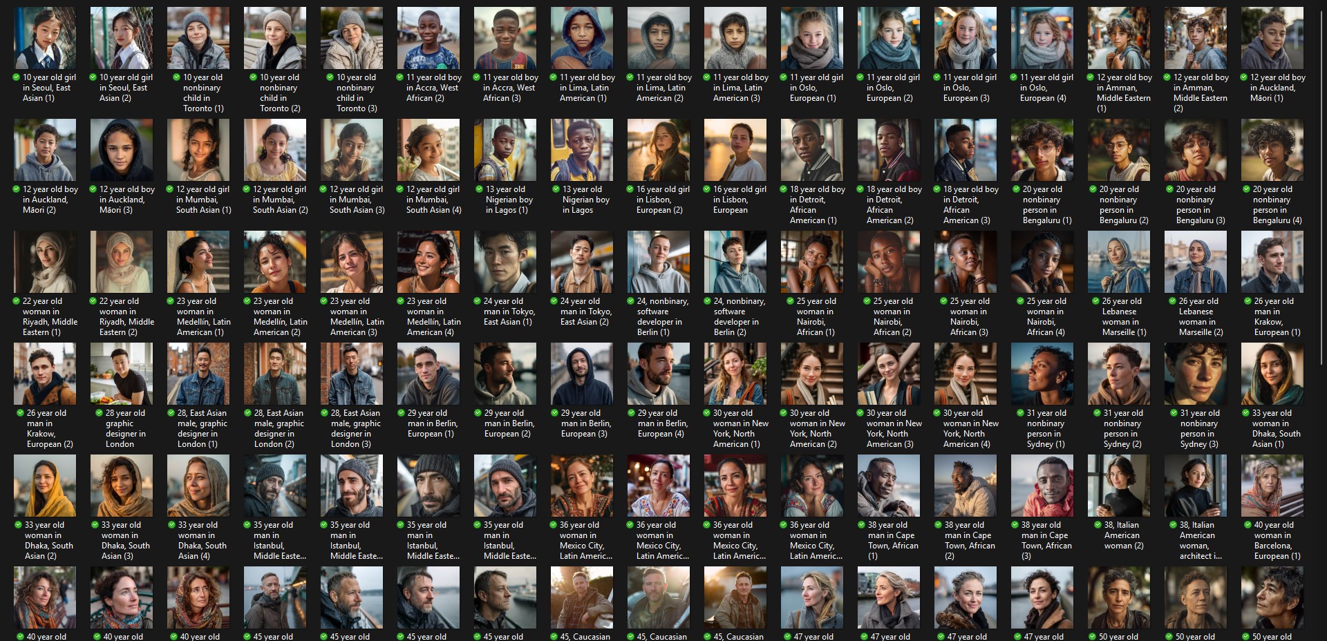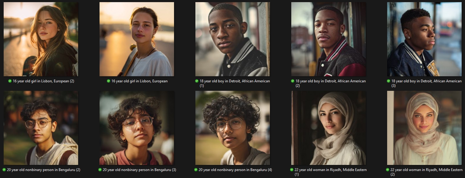 Realistic portraits, natural light, everyday backgrounds.